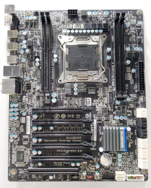 Per Gigabyte una scheda basata su X79 dodata di ben 14 porte SATA per lo storage, e 5 slot PCI-e 3.0 14 SATA. Notare la posizione dei slot per le ram (4 in tutto per il quad channel) attorno all'enorme socket 2011. Dissipatori a torre di generose dimensioni non troveranno scampo !