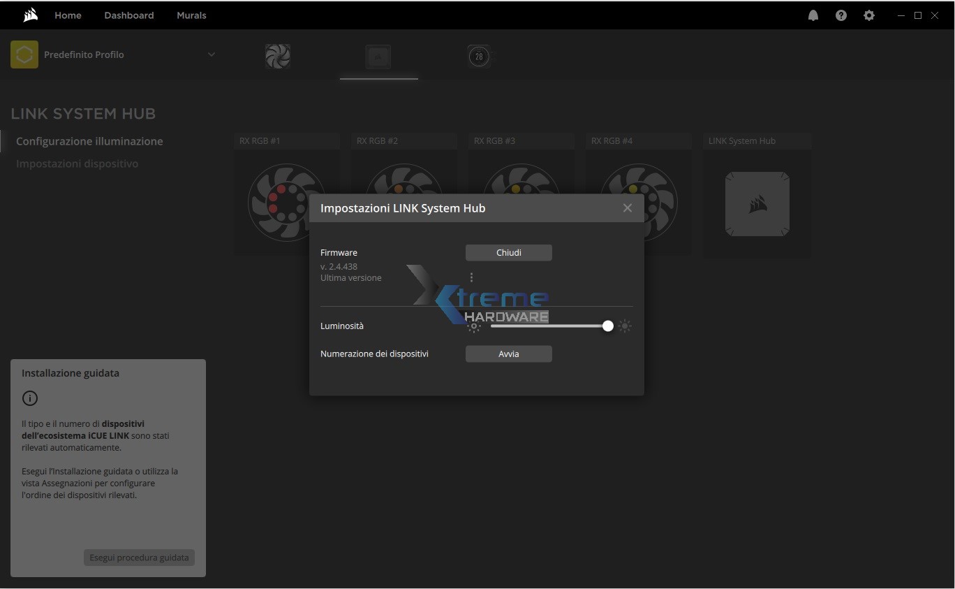 Ora per poter gestire il tutto non ci basterà altro che scaricare il software Corsair iCUE nel caso in cui non lo aveste già installato. L’ultima versione disponibile al pubblico è la 5.12.97. Avviato il software sicuramente vi verrà richiesto di aggiornare il firmware del Corsair Link System HUB che al momento della recensione è giunto alla versione 2.4.438. Terminati tutti i passaggi ‘’obbligatori’’ o comunque necessari al corretto funzionamento dei componenti non ci resta altro che sbizzarrirci nella personalizzazione delle nostre ventole RX120 RGB e dell’intero ecosistema appena creato.