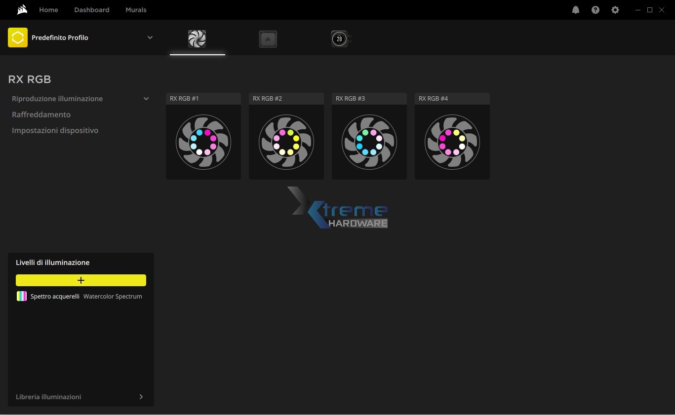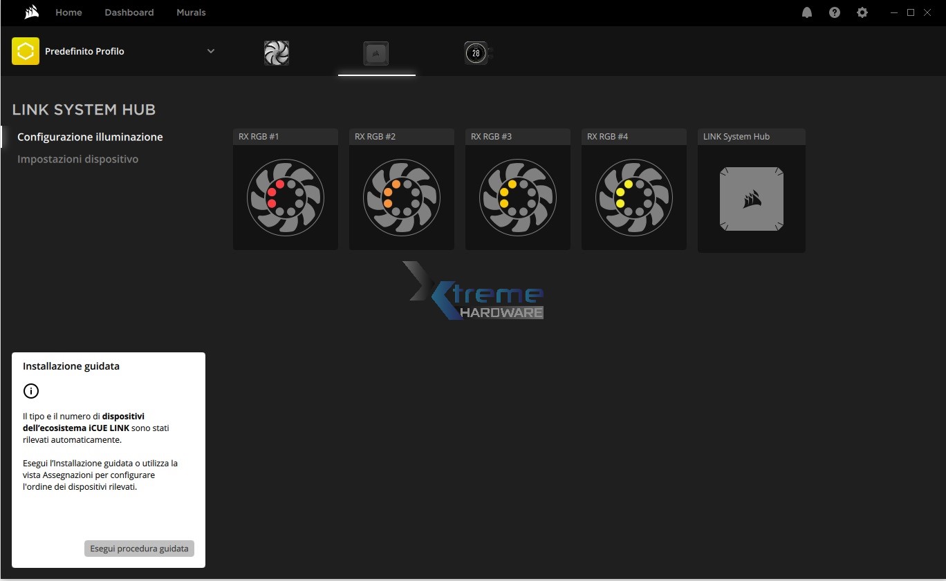Il software Corsair iCUE adotta la medesima interfaccia grafica vista in precedenza più e più volte. La schermata generale e principale vi mostrerà tutti i dispositivi, componenti Corsair compatibili e rilevati in quel momento. Nel nostro caso abbiamo le ventole RX120 RGB insieme al Corsair Link System HUB e al nostro AIO da 360 mm H150i Elite LCD.