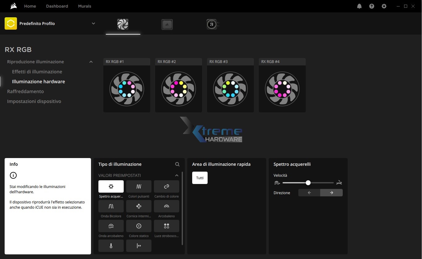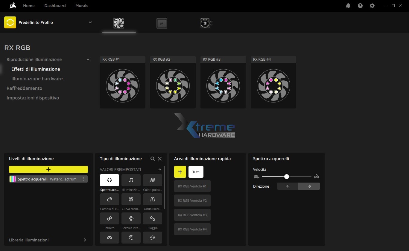 Nel caso in cui voleste provare già degli effetti predefiniti e che vi piacciono potete cliccare nel lato sinistro sotto la voce Murals. Questi effetti sincronizzano tutti i dispositivi compatibili a mostrare quel dato effetto di illuminazione. Nel caso in cui non siano di vostro gradimento e voleste uno o più colori di vostro gradimento al pari del relativo effetto di illuminazione vi basterà cliccare l’icona della ventola e in ‘’Effetti di Illuminazione’’ iniziare a dare libero sfogo al vostro estro.