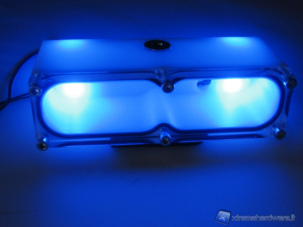 Riteniamo inutile effettuare test su questo prodotto: data la semplicità della vaschetta e grazie ai fori da 1/4’’ e nessun oggetto all’interno, non è assolutamente restrittiva. Vi mostriamo invece una foto in cui mostriamo il piacevole effetto che si può ottenere con dei LED di colore blu.