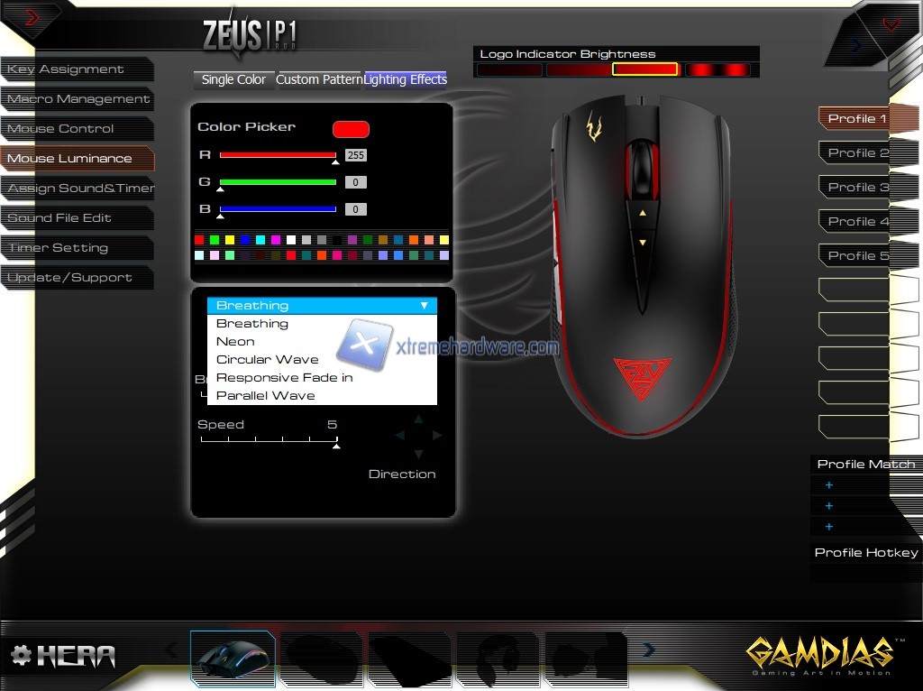 In ‘’Mouse Luminance’’ passeremo all’aspetto estetico e di personalizzazione dell’illuminazione a due zone del GAMDIAS ZEUS P1 RGB. Il logo GAMDIAS potrà essere illuminato solo di un singolo colore statico e relativo il Cycling dei DPI mentre le due ‘’strisce’’ perimetrali il mouse saranno personalizzabili con illuminazione RGB o a piacimento. Regolabile l’intensità di illuminazione e i due singoli effetti.