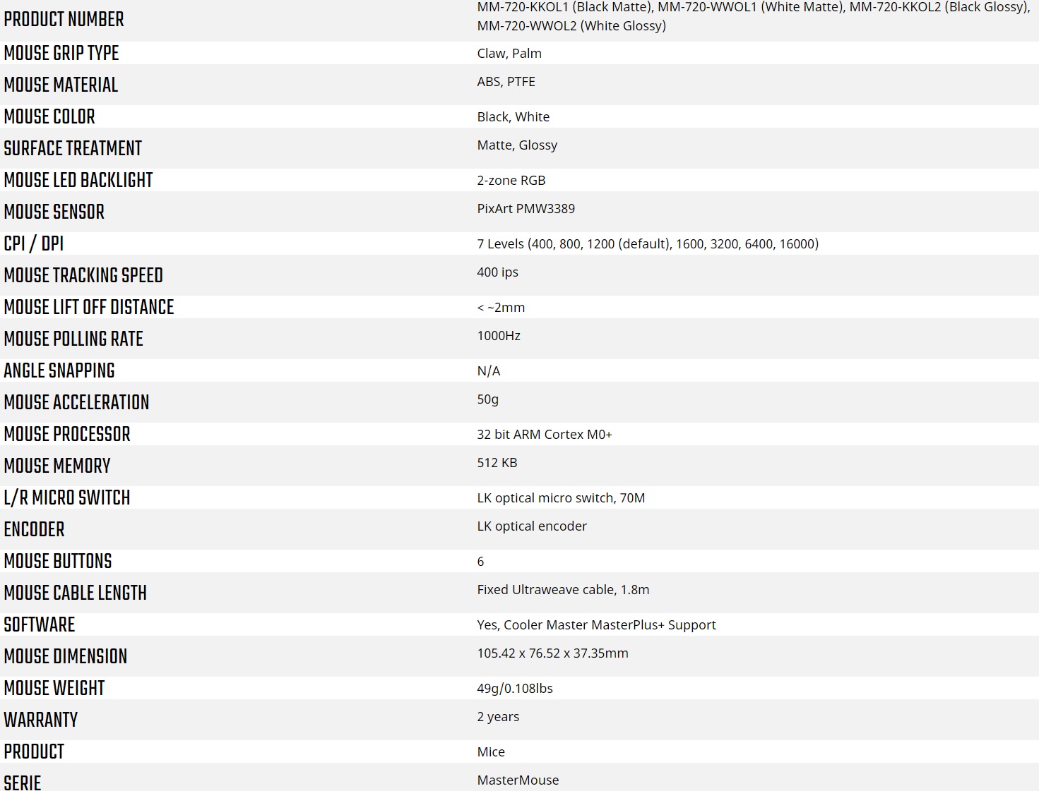 A seguire andiamo a riportare quelle che sono le specifiche tecniche del mouse MM720 di Cooler Master.