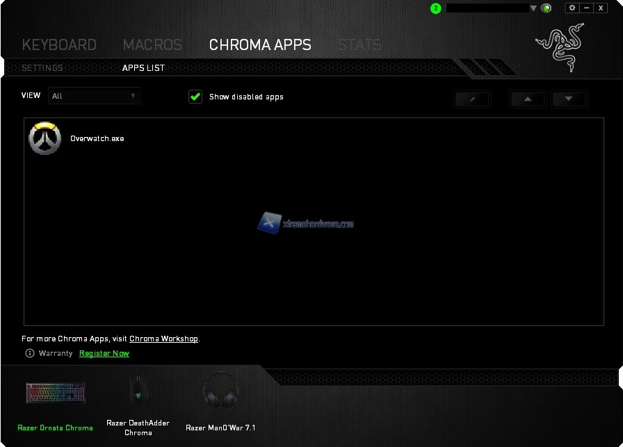 Menù ‘’Chroma Apps’’. Razer da quando ha creato il sito Chroma Workshop ha messo a disposizione una vasta raccolta di applicativi compatibili con il sistema Chroma nonché diversi effetti da scaricare e importare successivamente per i più famosi giochi tra cui il più recente Overwatch.