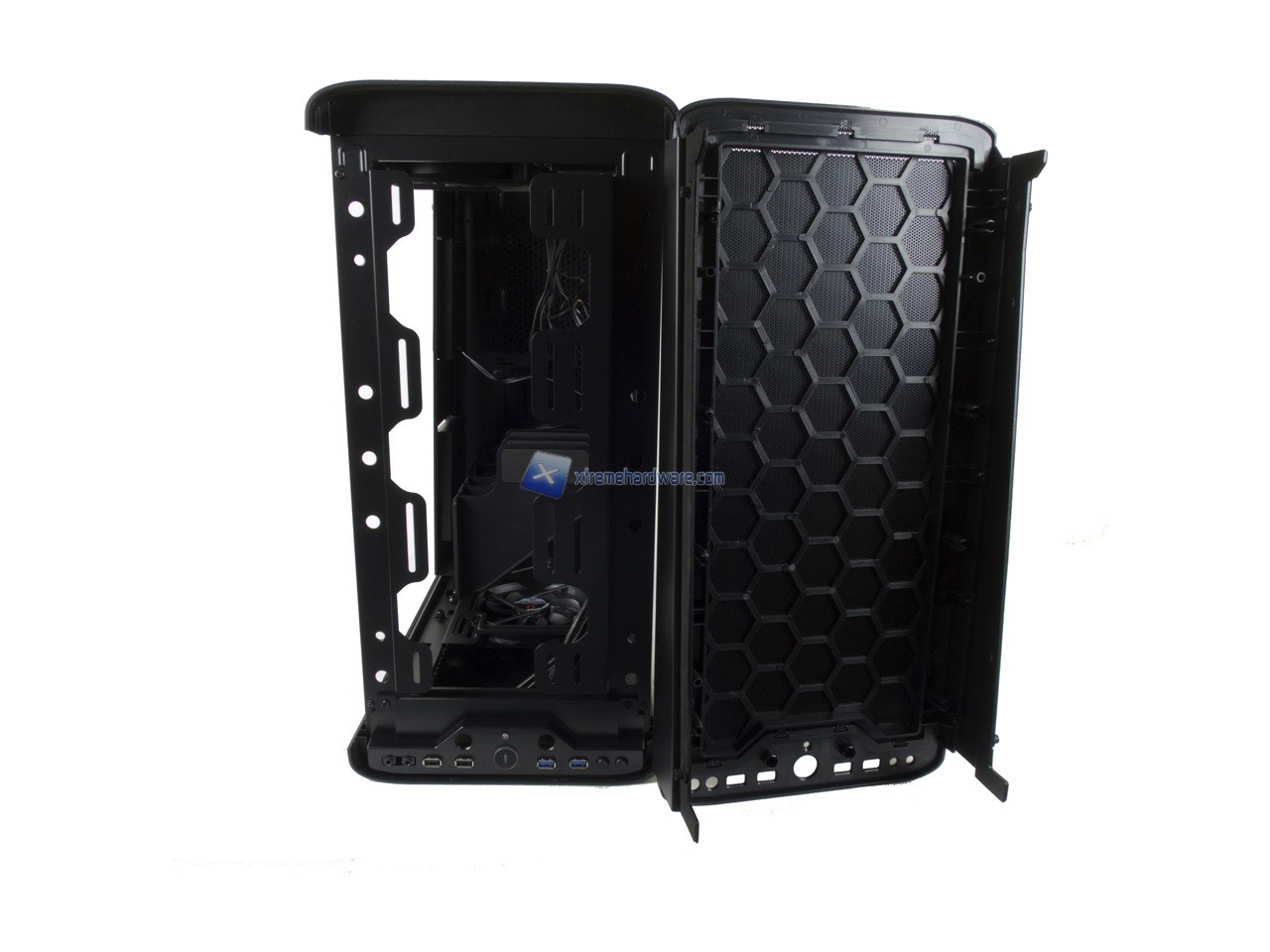 Spostandoci nel lato di destra possiamo osservare il classico Tray della scheda madre contornato da diversi fori per il passaggio dei cavi.