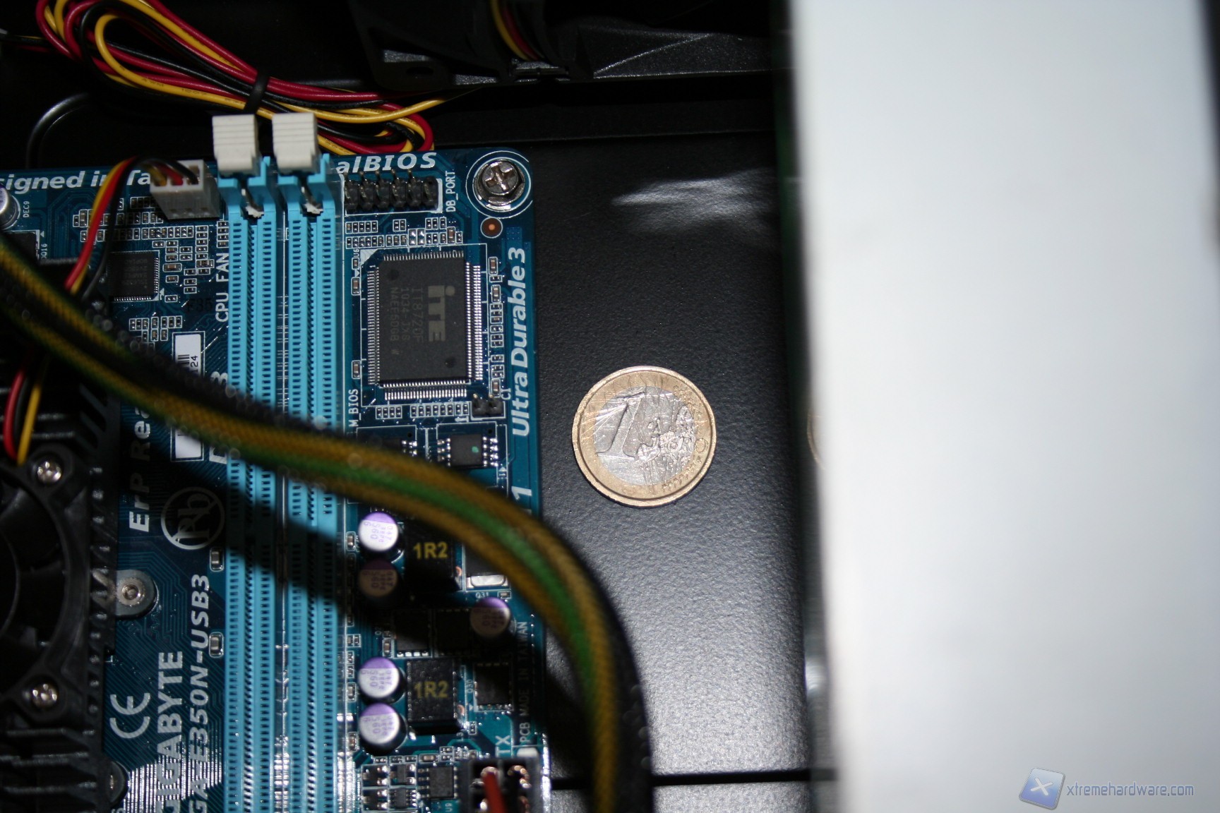 Abbiamo preanunciato che l'installazione di una scheda madre E-ATX è piuttosto difficoltosa se non possibile: vediamo perché. Come potete notare dalle seguenti foto, schede madri in formato E-ATX andranno ad occupare tutto lo spazio presente tra la paratia posteriore e le ventole da 120mm, non lasciando alcuno spazio per le connessioni posizionate in modo parallelo al PCB.