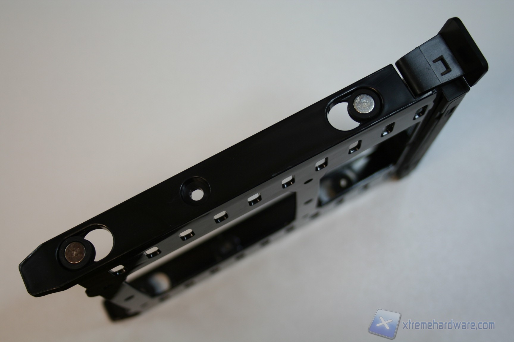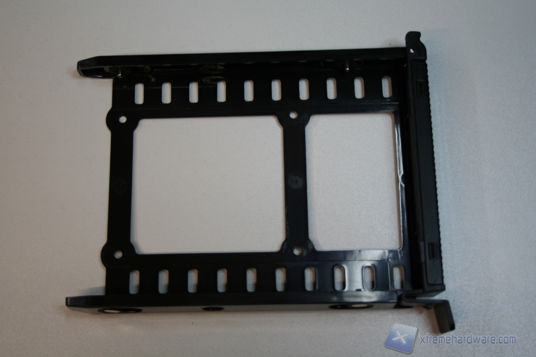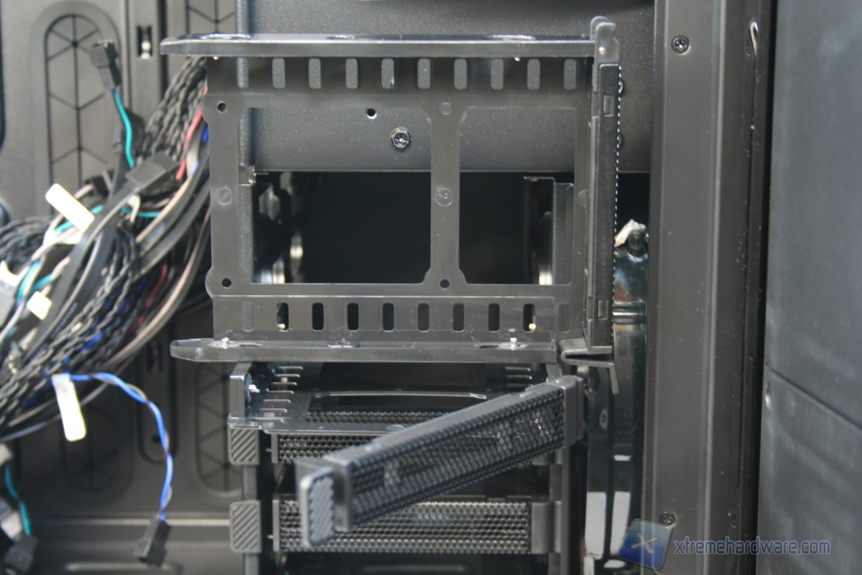 La gestione dei dischi rigidi è esemplare. Siamo dinanzi ad una soluzione incentrata su cage removibili, di tripla tipologia e totalmente ventilati da ventole di diverso diametro, eccetto quelli hot swap frontali. Il cage situato dinanzi alla ventola anteriore da 200mm permette l’installazione di 5 hard disk da 3.5”, ed altrettanti SSD da 2.5”, tramite un classico meccanismo a scorrimento e blocco orizzontale; sono presenti dei perni di bloccaggio dotati di disaccoppianti in gomma, quindi non ci sarà nessun problema per eventuali vibrazioni. Nulla è lasciato al caso! Ai fini del modding sarà possibile staccare agevolmente questo cage, tramite la rimozione di viti.