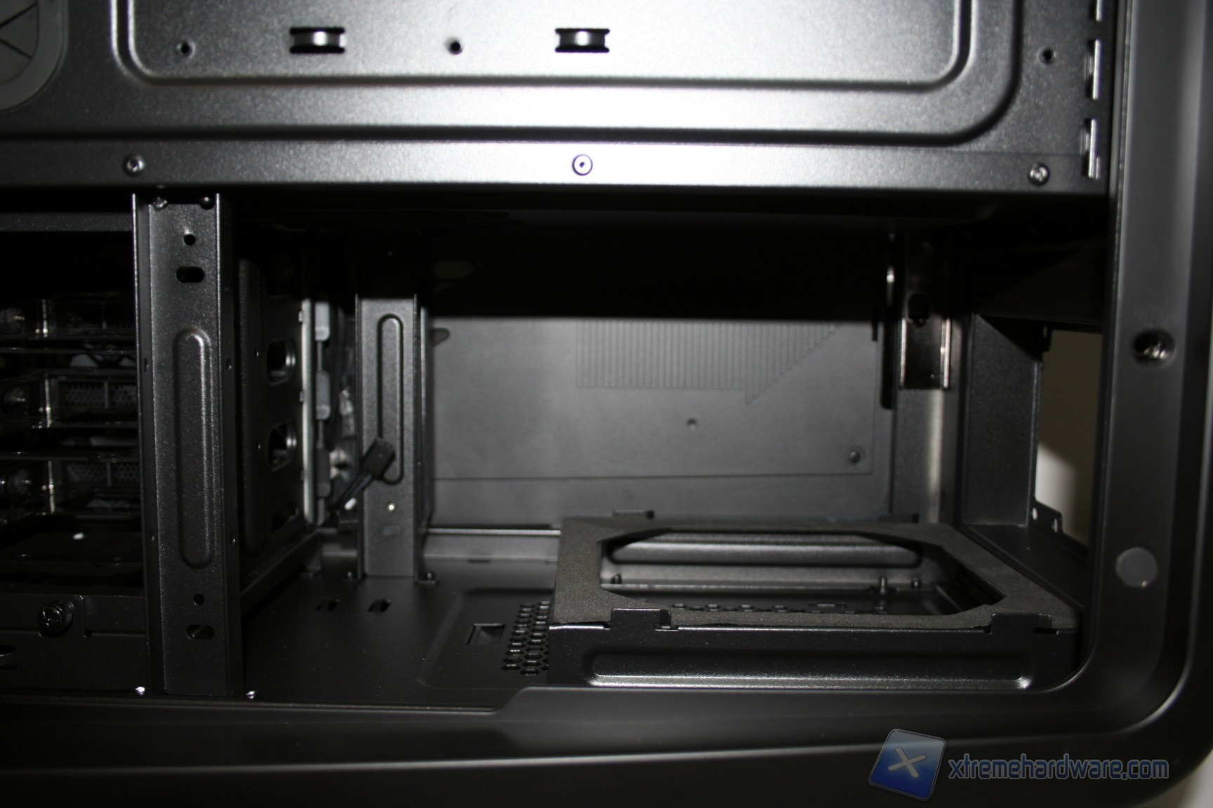 Il piatto della scheda madre è interamente in acciaio e diversamente da alcuni modelli di cabinet top di gamma degli anni passati non è removibile. La qualità, la robustezza e lo spessore sono tanto evidenti quanto di livello e sono presenti 8 guaine in gomma antitaglio, la cui stabilità risulta essere davvero elevata, e quindi non ci sarà nessuna fuoriuscita delle stesse, dagli incavi, all’atto del passaggio dei cavi. Nella parte superiore sono presenti due grandi aperture per il passaggio dei cavi, molto pratiche per via della dimensione, ed oltre a questo ovviamente è presente l’apertura del piatto della scheda madre. Abbiamo apprezzato in particolar modo la grandezza del foro, nella parte superiore sinistra, dove sarà possibile far passare il connettore di alimentazione ausiliario della scheda madre da 4/8pin, in quanto non ci sarà nessun problema all’atto del ripiegamento dello stesso, per inserirlo nel corrispettivo connettore di alimentazione della scheda madre. La fessura d’installazione per il backplate posteriore è decisamente grande e permetterà tranquillamente il montaggio di dissipatori particolarmente complessi. Lo spazio tra la scheda madre e la ventola superiore da 200mm è leggermente superiore allo standard ma notifichiamo che questa ventola, o ventole alternative, sarà possibile posizionarle sopra alla paratia di acciaio di bloccaggio, aumentando quindi lo spazio in questo settore. Questo implica che la procedura di assemblaggio sarà facilitata, che non ci sarà nessun problema durante il montaggio di dissipatori particolarmente grandi oppure di un radiatore da 240mm ad elevato spessore nella parte superiore. Posteriormente si hanno ben dieci aperture dove inserire fascette restringenti, il che permette un livello di pulizia e di ordine elevatissimo. Oltre a ciò, sarà possibile montare un radiatore da 240mm in posizione superiore, oppure un radiatore da 120/140mm con spessore doppio nella parte posteriore, al posto della ventola preinstallata. Affronteremo meglio le possibilità di integrazione a liquido in un capitolo separato.