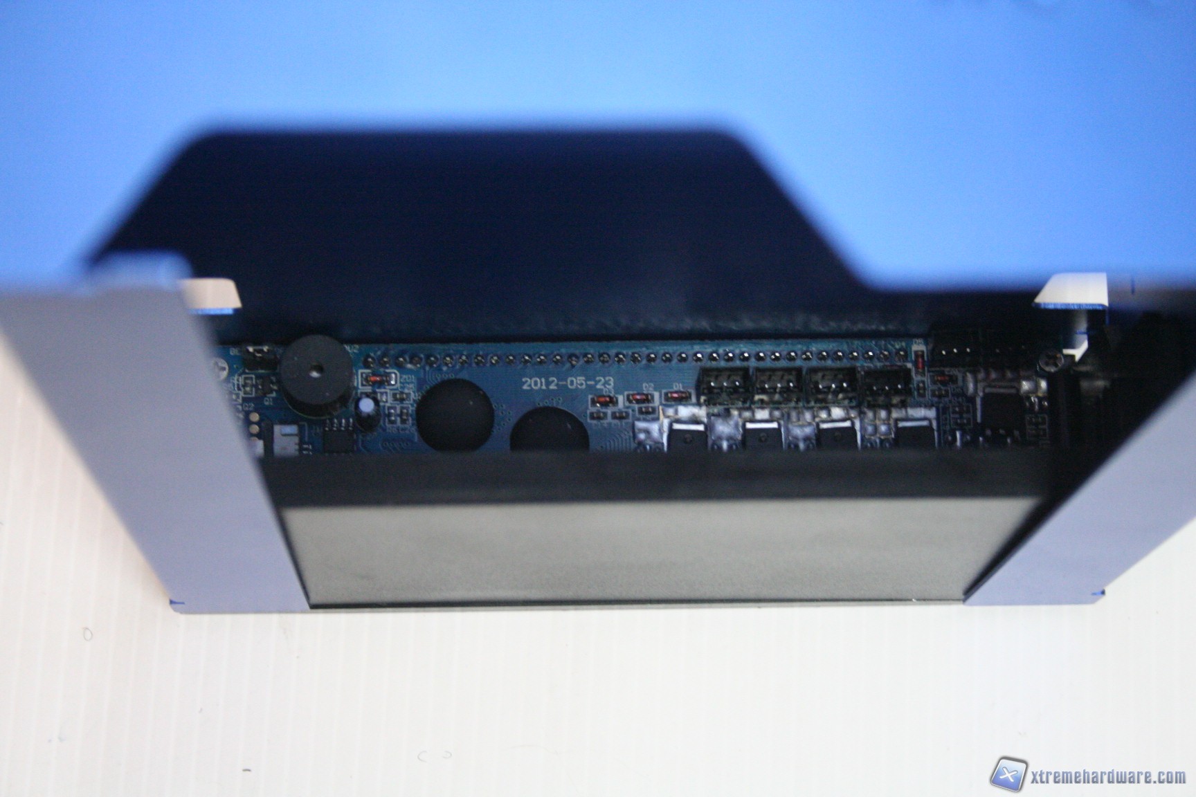 Il layout interno è moderno, senza esagerare in dimensioni; questo comporta però che la tolleranza in profondità per dissipatori aftermarket e lo spazio superiore per il cablaggio sono limitati. Presenta elementi innovativi tra cui prima di tutto il sistema di installazione dei dischi rigidi, leggermente problematico qualora i plate non fossero riposti correttamente, ma molto rigido e soprattutto, tool-less. L’orientamento della scheda madre è classico ATX, il posizionamento dei bay per gli hard disk è nella parte laterale sinistra e frontale, con orientamento orizzontale. E’ standard anche il posizionamento delle periferiche da 5.25” anche se c’è un inclinazione verso il basso particolarmente accentuata, possibile grazie ad un sistema di blocco removibile. Non c’è separazione fra i diversi scompartimenti, che porterebbe ad un isolamento a livello termico, data la struttura aperta. La colorazione interna è completamente blu/grigia e non sono presenti guaine in gomma per il passaggio dei cavi.