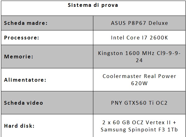 La CPU (i7 2600K) non è stata overcloccata e la sua frequenza è rimasta a default (3.4GHz), inoltre non sono stati modificati i parametri di risparmio energetico e quelli relativi alla tecnologia Turbo Boost.