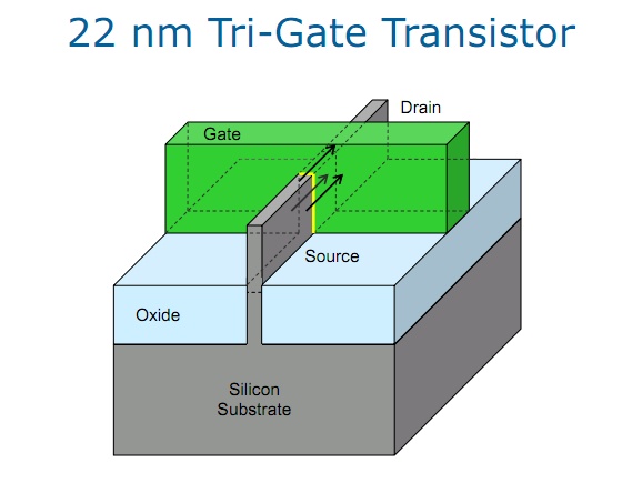 Nella neonata struttura tri-gate possiamo notare come l'aletta di silicio che si solleva dalla base permetta lo scambio su ben tre facce, aumentando la superficie di contatto, quindi incrementando le prestazioni.