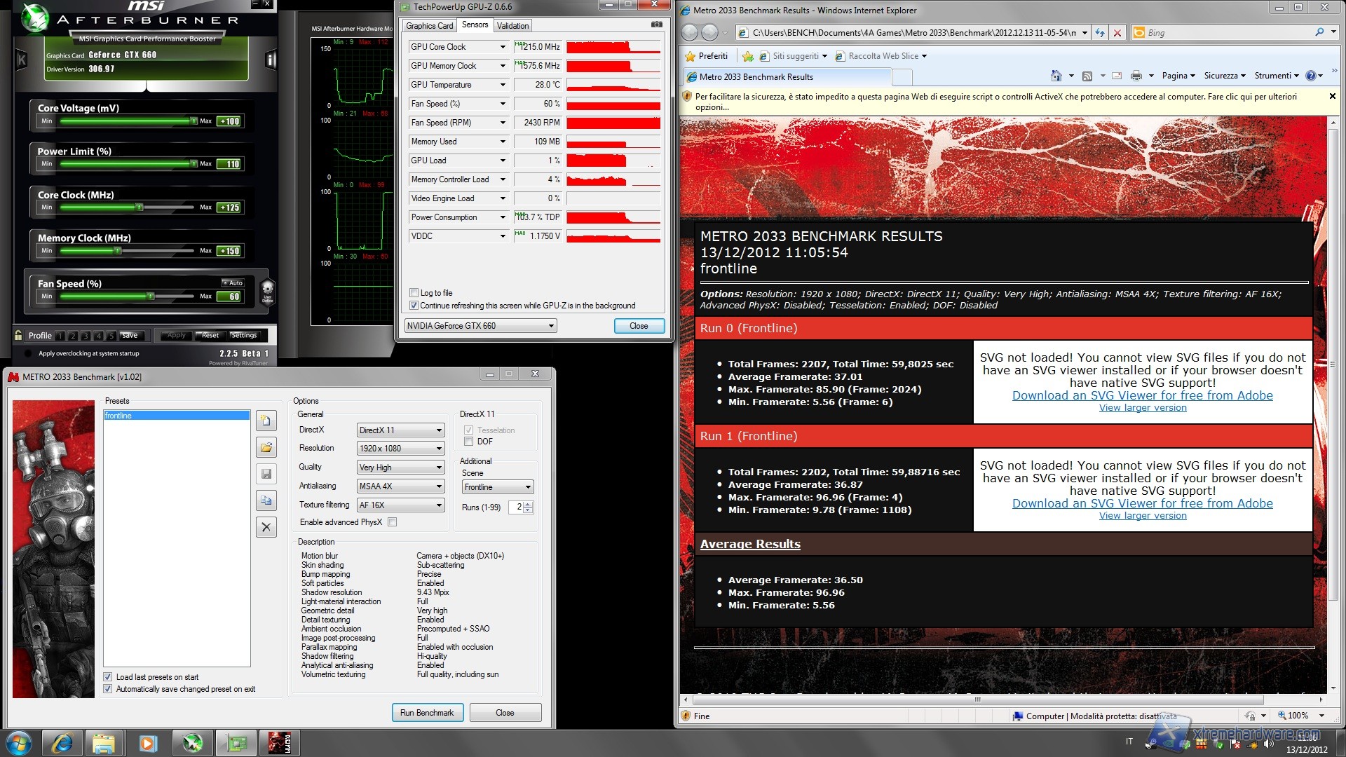 In questo modo abbiamo assicurato un buon raffreddamento della scheda uniti ad un pizzico di overvolt, in realtà vediamo che l'overvolt agisce solo sul Vcore minimo e non su quello massimo. Vi mostriamo di seguito una schermata con tutti i parametri da noi modificati nel noto benchmark del game Metro 2033: